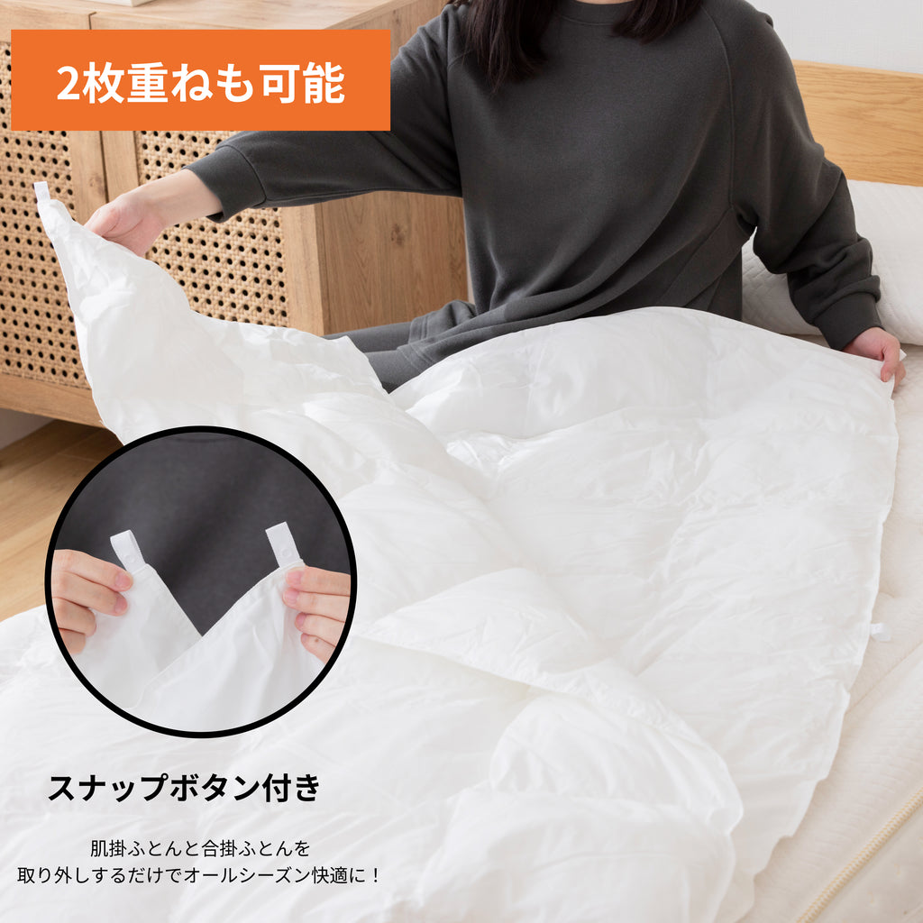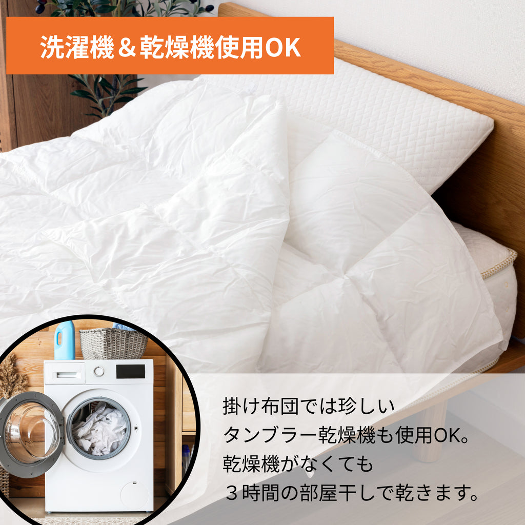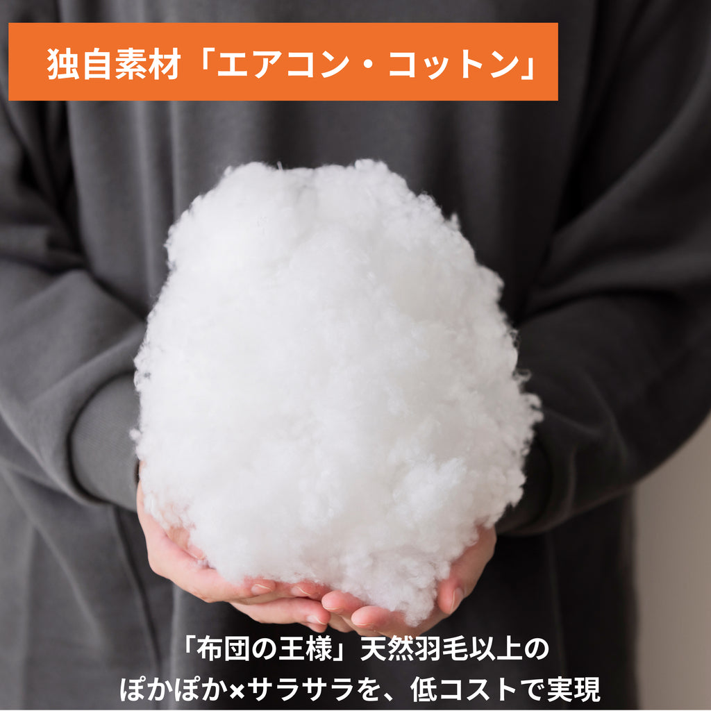 「布団の王様」「天然のエアコン」と呼ばれる天然羽毛の弱点を克服した、いいとこ取りの新素材「エアコン・コットン」をふんだんに使用した贅沢な掛け布団。