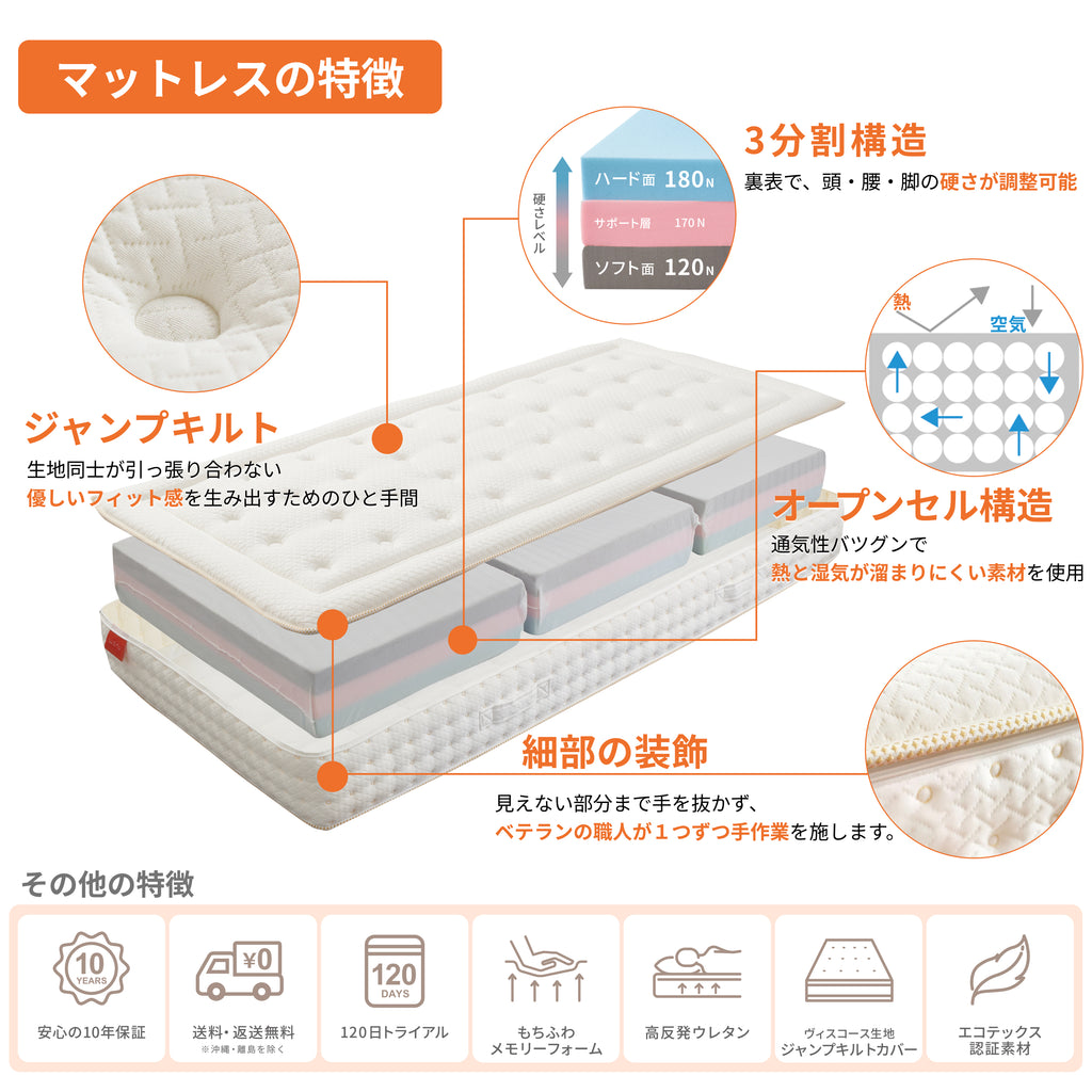 自信があるからできる10年間の品質保証付き。正しくご使用頂いている中で、マットレスに2.5cm以上のヘタリが出た場合、マットレス中芯材に限って保証いたします。